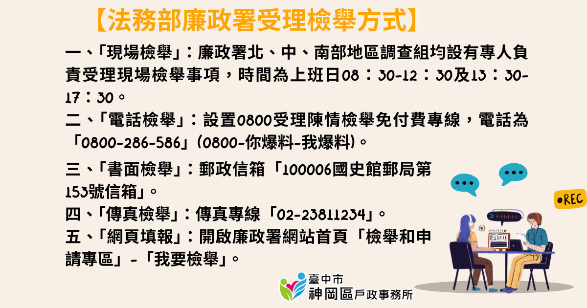 一、「現場檢舉」:廉政署北、中、南部地區調查組均設有專人負責受理現場檢舉事項,時間為上班日08:30-12:30及13:30-17:30。